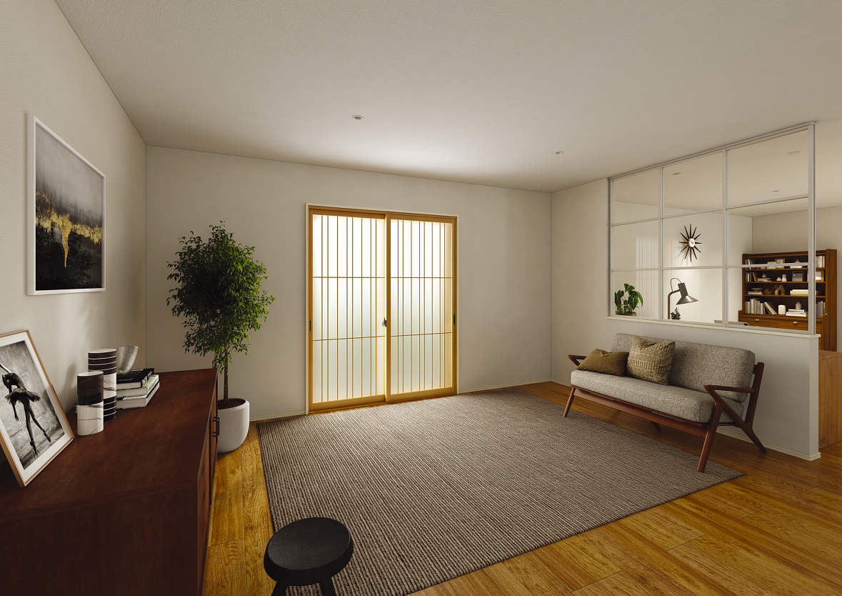 すりガラスの内窓が取り付けられたリビング